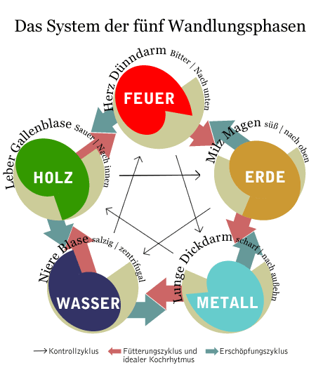 Eine weitere Grundlage der TCM sind die fünf Wandlungsphasen: Holz, Feuer, Erde, Metall, Wasser. Diese sind tages-und jahreszeitlich zugeordnet und existieren in dieser temporären Abfolge kontinuierlich, in dem sie sich hervorbringen oder bändigen (siehe Abbildung).
